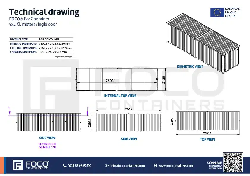 - Dimensões estendidas: 8×2 metros, dividido em 2 contentores 4×2 XL e com um kit de conexão, oferece espaço adicional para a expressão do seu negócio em relação ao modelo normal.